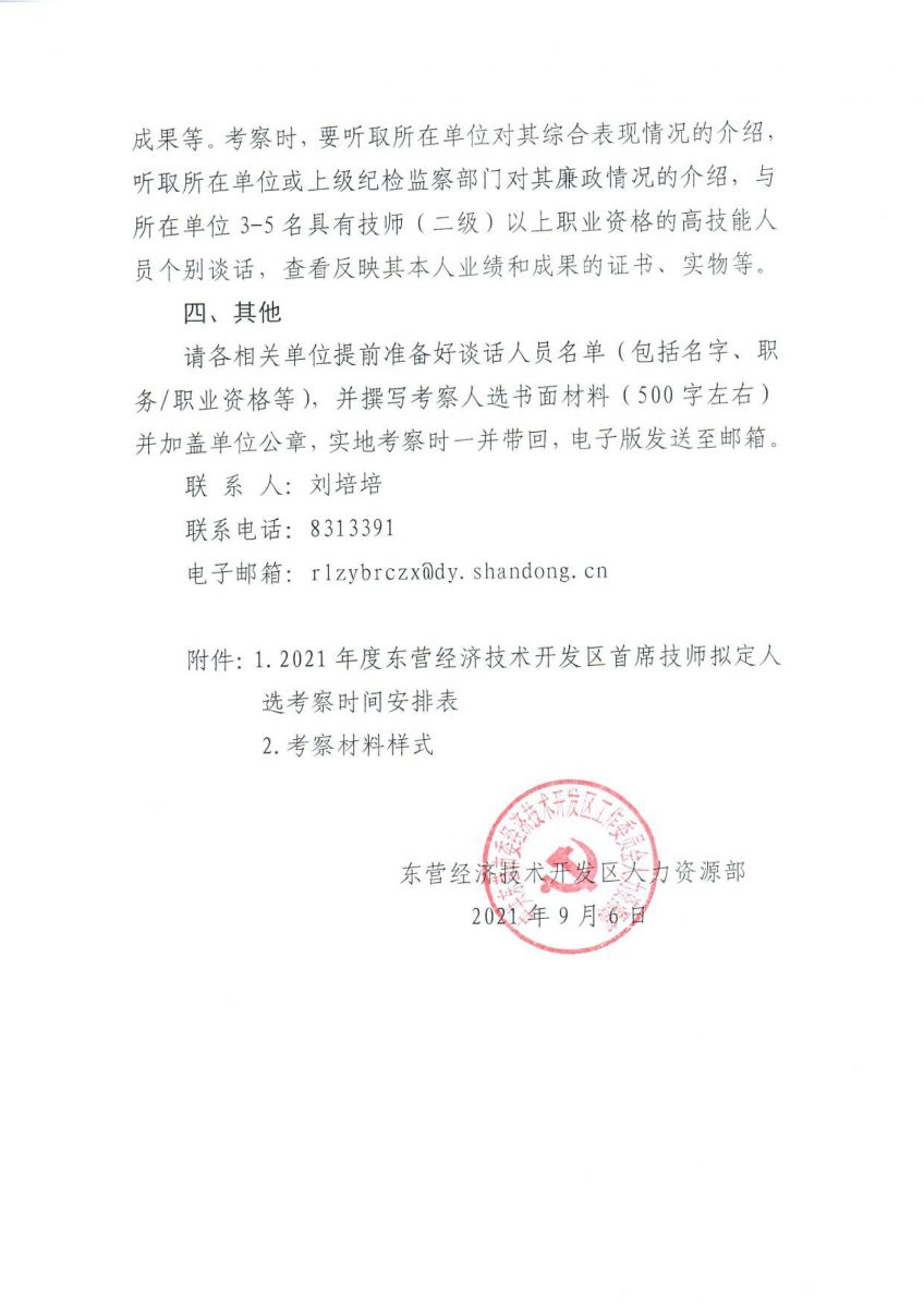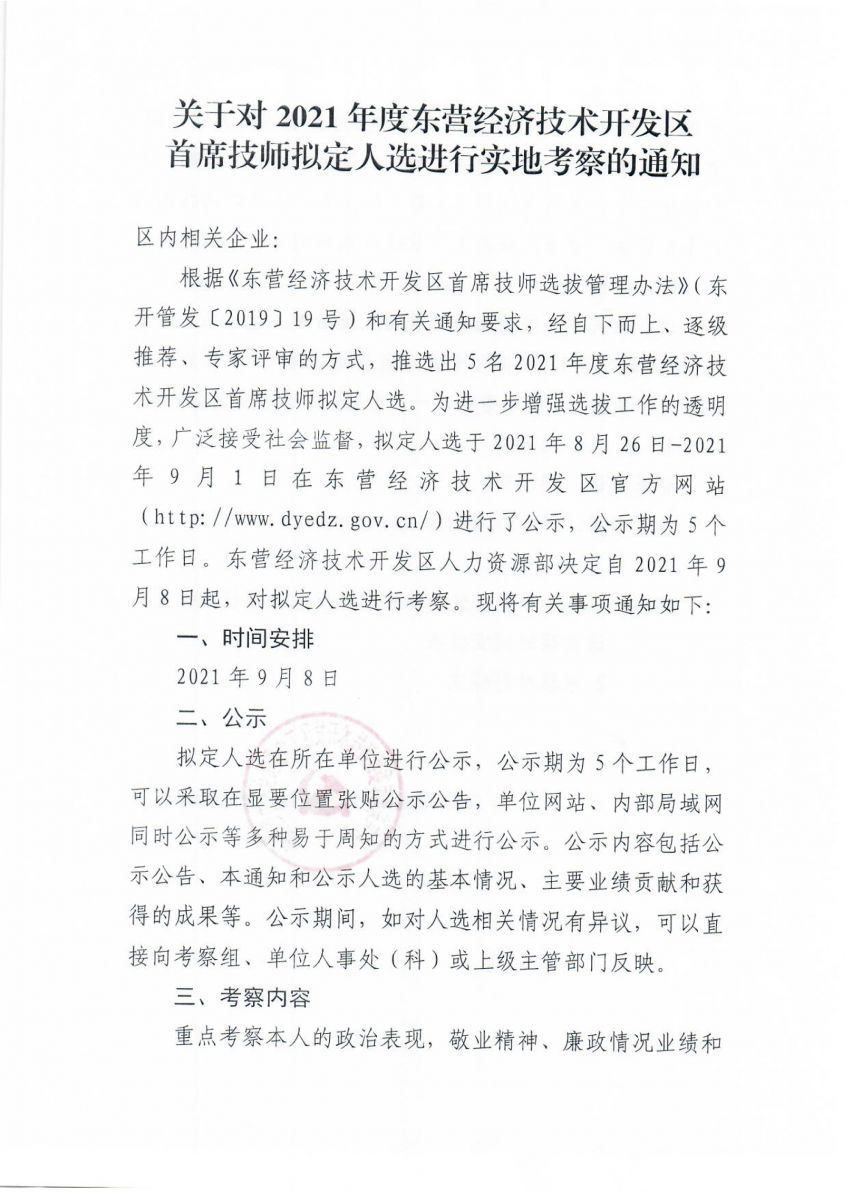 关于对2021年度东营经济技术开发区首席技师拟定人选进行实地考察的通知