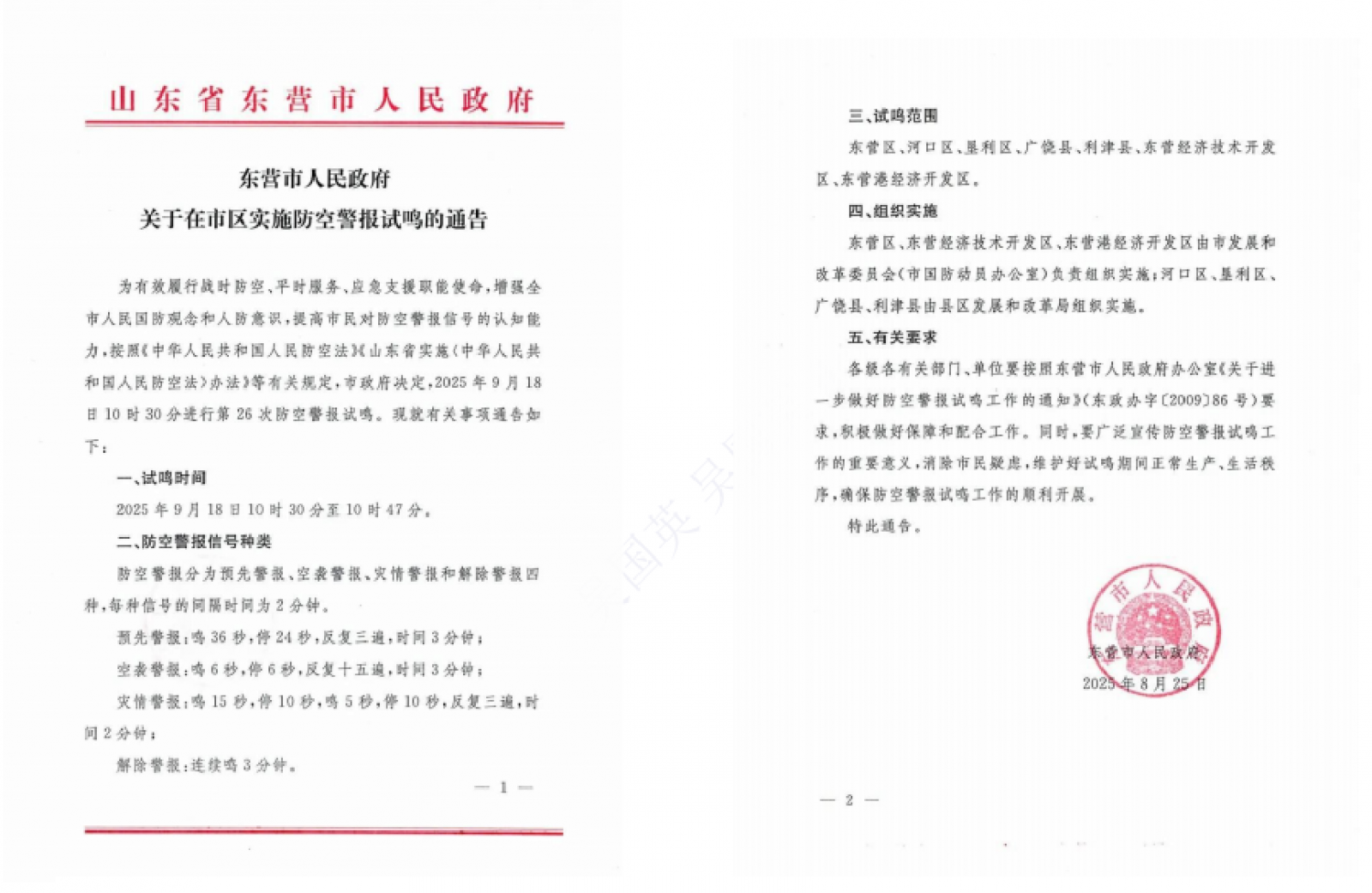 2025年9月18日10时30分至10时47分,东营市将在市区进行第26次防空警报试鸣。(信息来源: